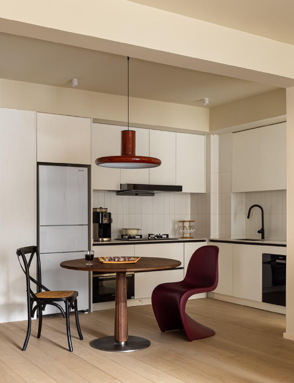 一个人独居,无需一个标准的餐厅。一张中古的实木圆桌,一把时尚的潘通椅,反而让空间在灵活、松弛中,彰显出了独有的用餐仪式感。