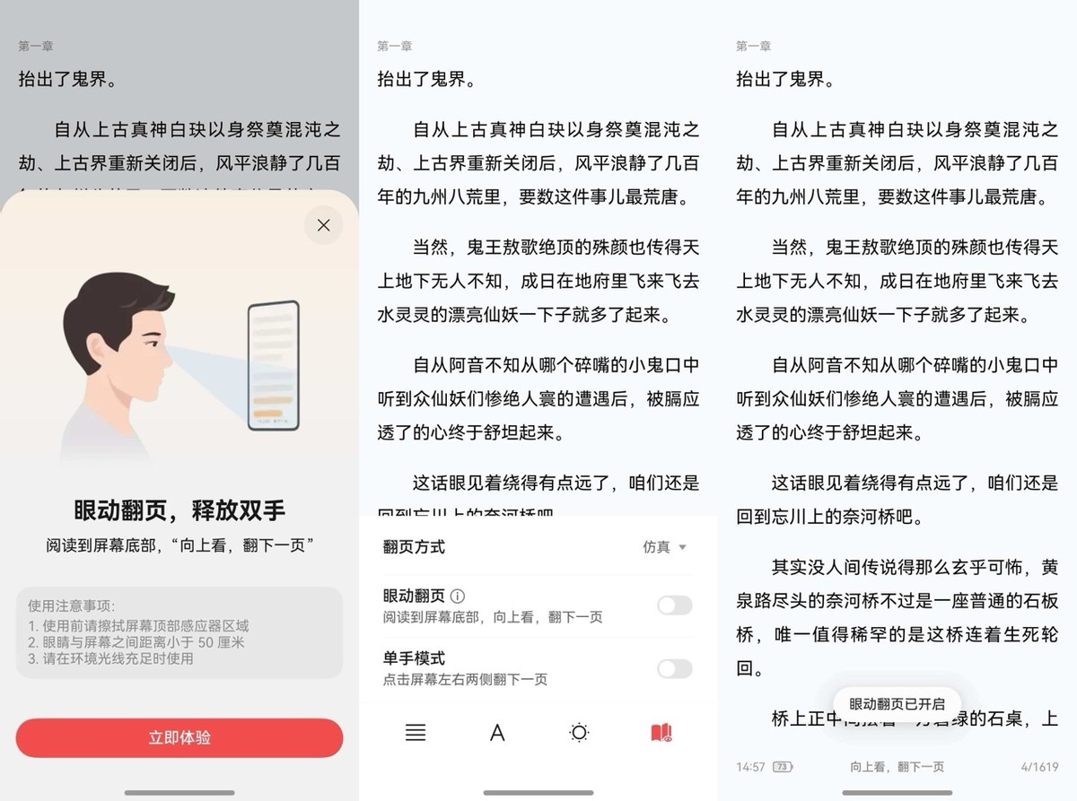 后来在许多生活场景里,我也感受到AI眼动翻页的价值:吃大闸蟹时腾不开手,只要一个眼神就能完成翻页;厨房里等汤煮沸的间隙,湿手不必触碰屏幕,也能通过“眼神杀”瞬间看到下一页的内容;到了冬天,手机夹在支架上,双手无需伸出被窝,仅靠眼动翻页就能完成阅读。