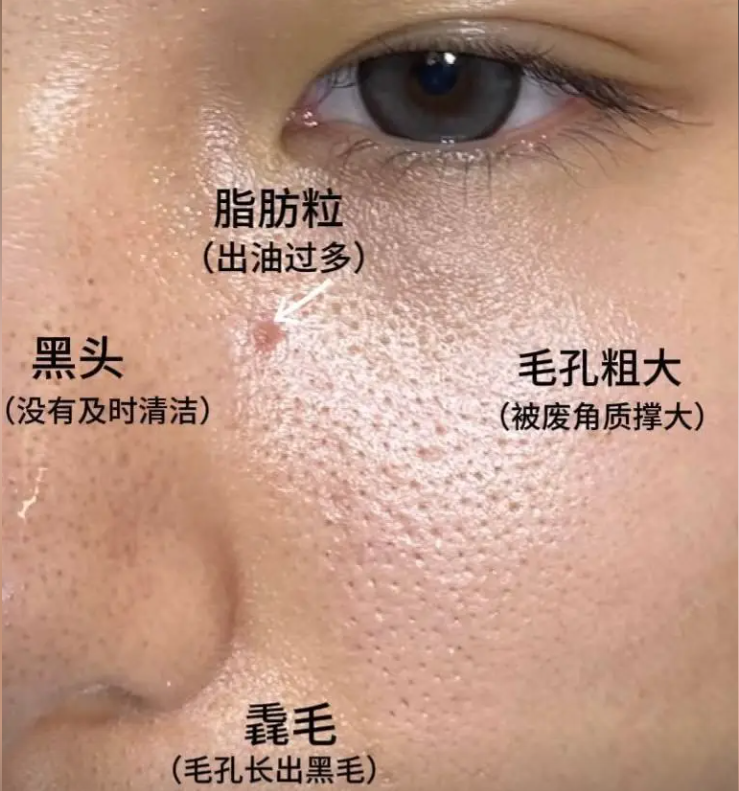 角质层堆积角质层代谢不畅,死皮细胞堆积在毛孔口,会导致毛孔看起来粗大。长期不清理,还可能引发闭口粉刺。