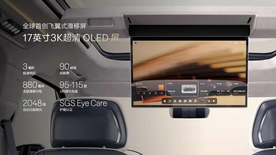 极氪9X还搭载全球首创的17英寸3K超清OLED飞翼式滑移屏,彻底解决后排吸顶屏与天窗开启的冲突。通过车顶高强度滑轨结构,飞翼式滑移屏可实现88厘米无极滑移与5档角度调节,无论乘客落座哪一排、以何种坐姿,屏幕都能“飞”至面前,随时呈现大千世界的无限精彩,用远见让掌控千里视野成为现实。