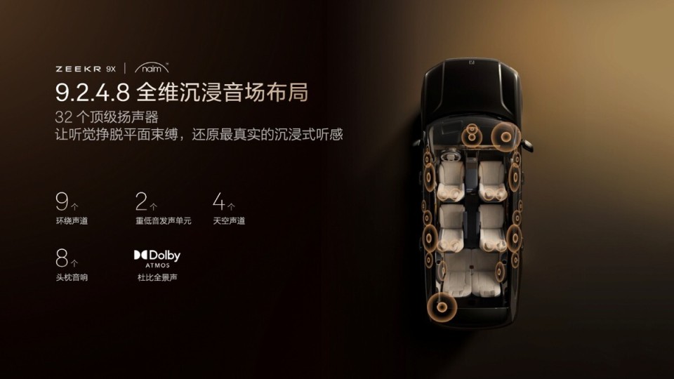 极氪9X的Naim殿堂之声音响系统采用9.2.4.8全维沉浸音场布局