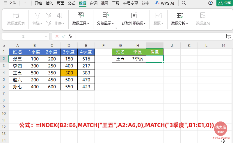 =INDEX(B2:E6,MATCH("王五",A2:A6,0),MATCH("3季度",B1:E1,0))然后点击回车即可