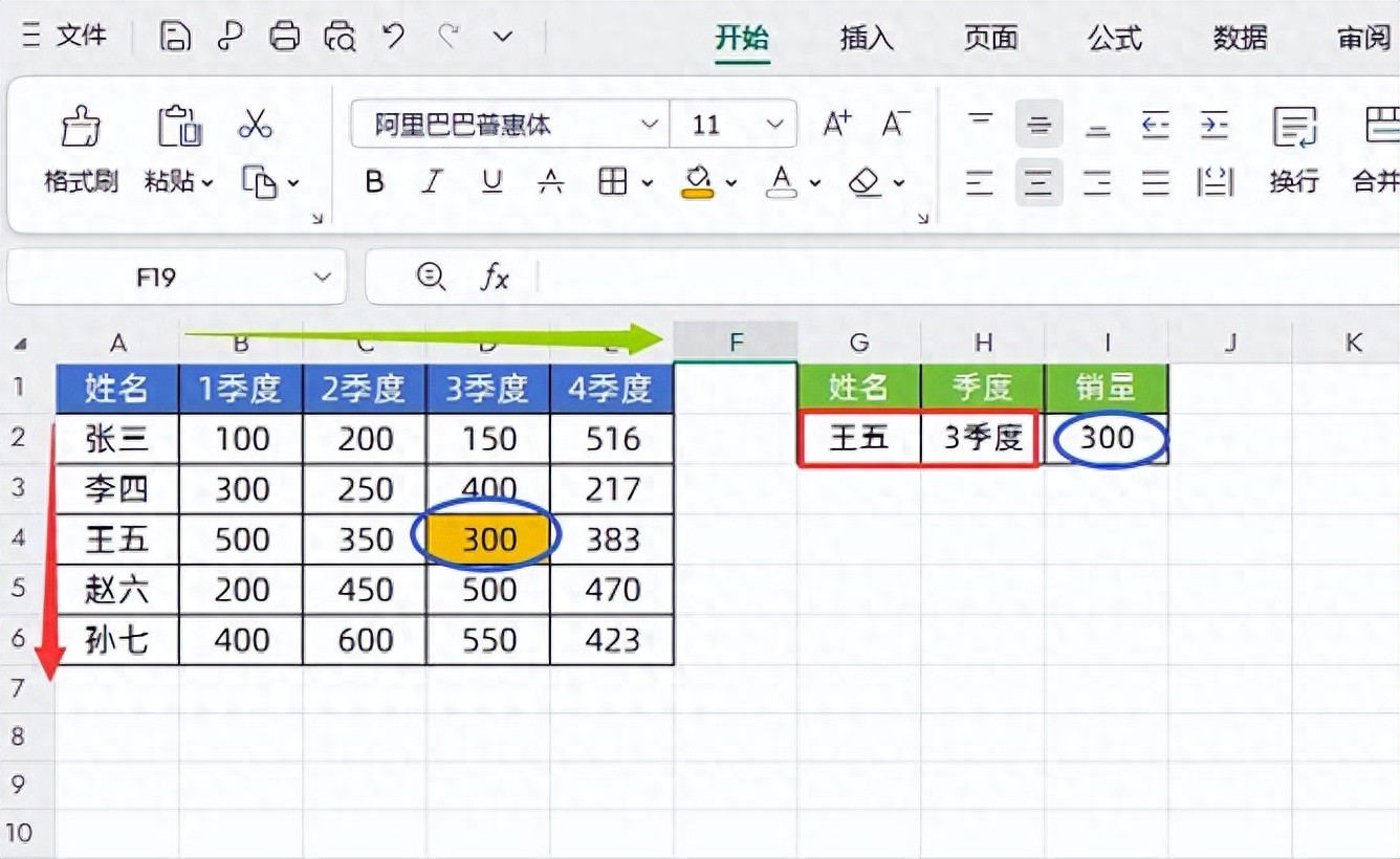 在下面实例中我们根据左侧表格中的纵向【姓名】和横向【季度】来查找最终的销售额,一个是纵横的,一个是横向的,也就是交叉查询。