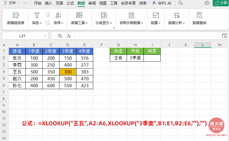 ②外层XLOOKUP("王五",A2:A6, ...):在行标题区域A2:A6中查找“王五”,并从内层返回的列(D2:D6)中取出对应的值,最终得到300。