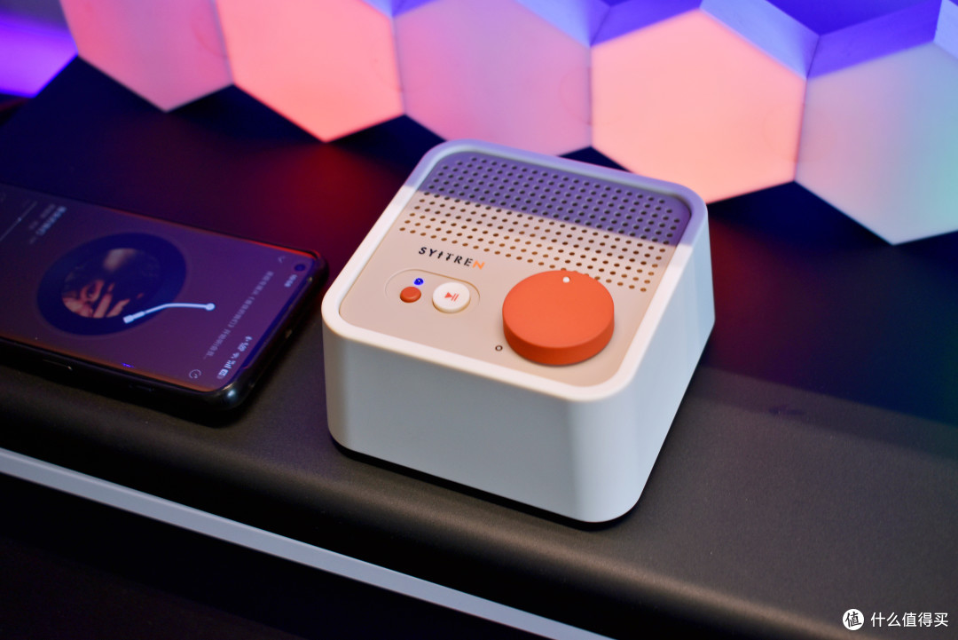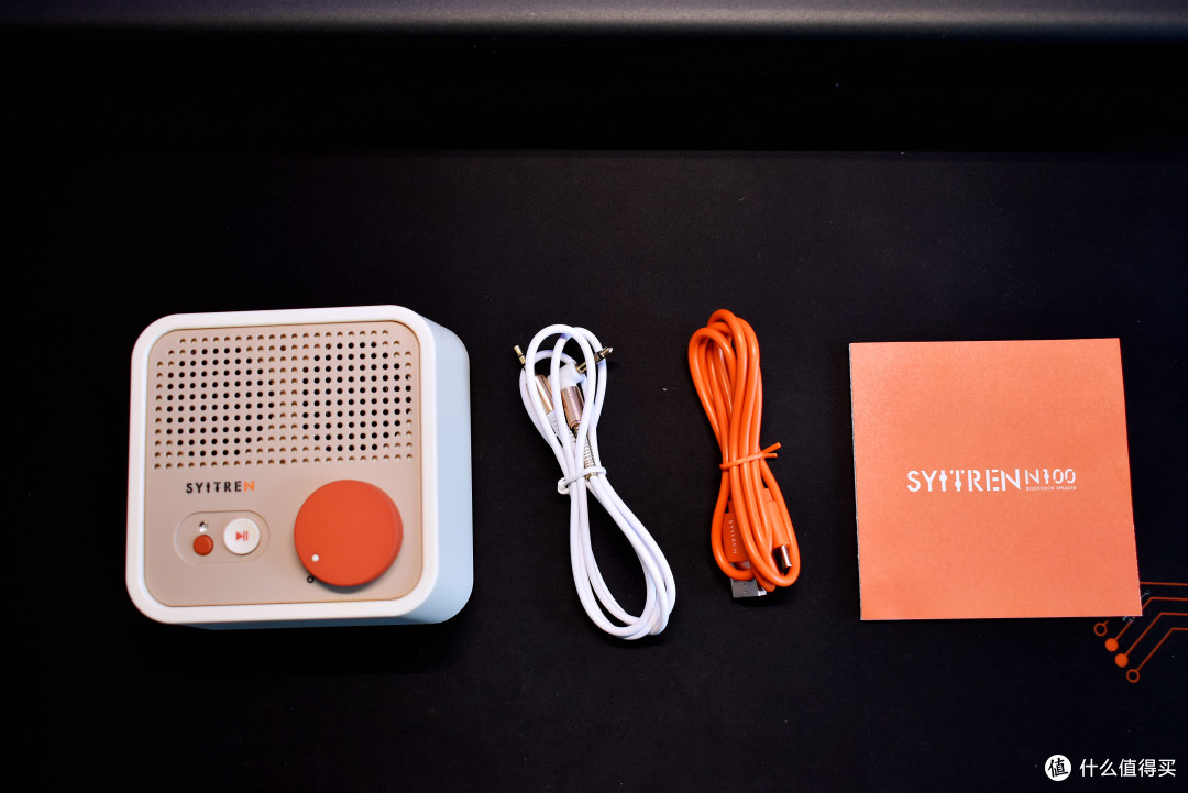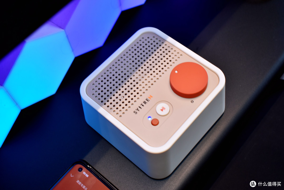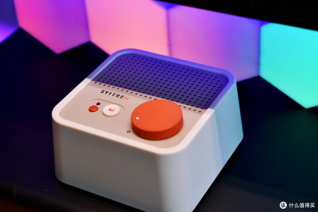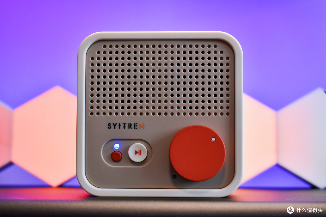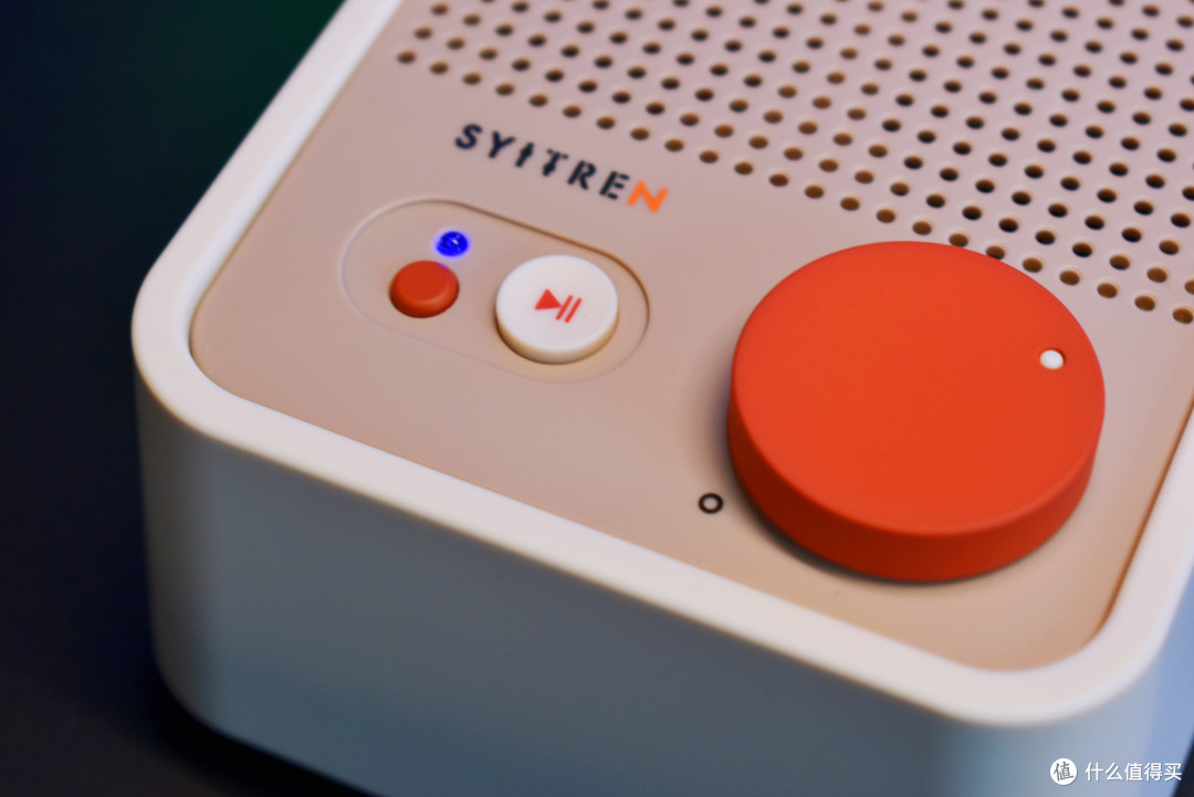 “SYITREN” 赛塔林的品牌 LOGO 下方,是经典白红配色的暂停 / 播放按键,醒目亮眼,操作轻松便捷。它左侧有一个小小的橙色按键,单击此键,音箱便能在蓝牙和 AUX 两种模式间自如切换;长按的话,还可重置蓝牙连接。蓝牙 /AUX 连接指示灯通过蓝色和红色显示,让用户能够直观了解音箱的连接状态。
