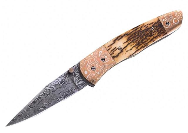 拉里·唐尼为特德·莫尔(Ted Moore)的折刀制作了一把大马士革钢刃片,由玛德琳·克拉明(Madeline Crumling)雕刻。框架和衬里是416不锈钢材质,镶嵌物为黑色笔形贝壳。刀片和闭合长度分别为2.5英寸和3.5英寸。