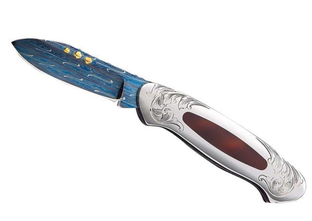 安德鲁·塔卡奇(Andrew Takach)的“锁扣折刀”由大马士革刀片、呈鸟嘴状的猛犸象牙手柄和镶嵌了24K金箔的大马士革衬垫组成。