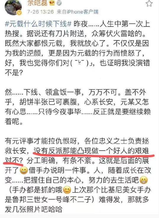“能对角色恨之入骨,恰恰说明余老师的演技出神入化,挺余老师”