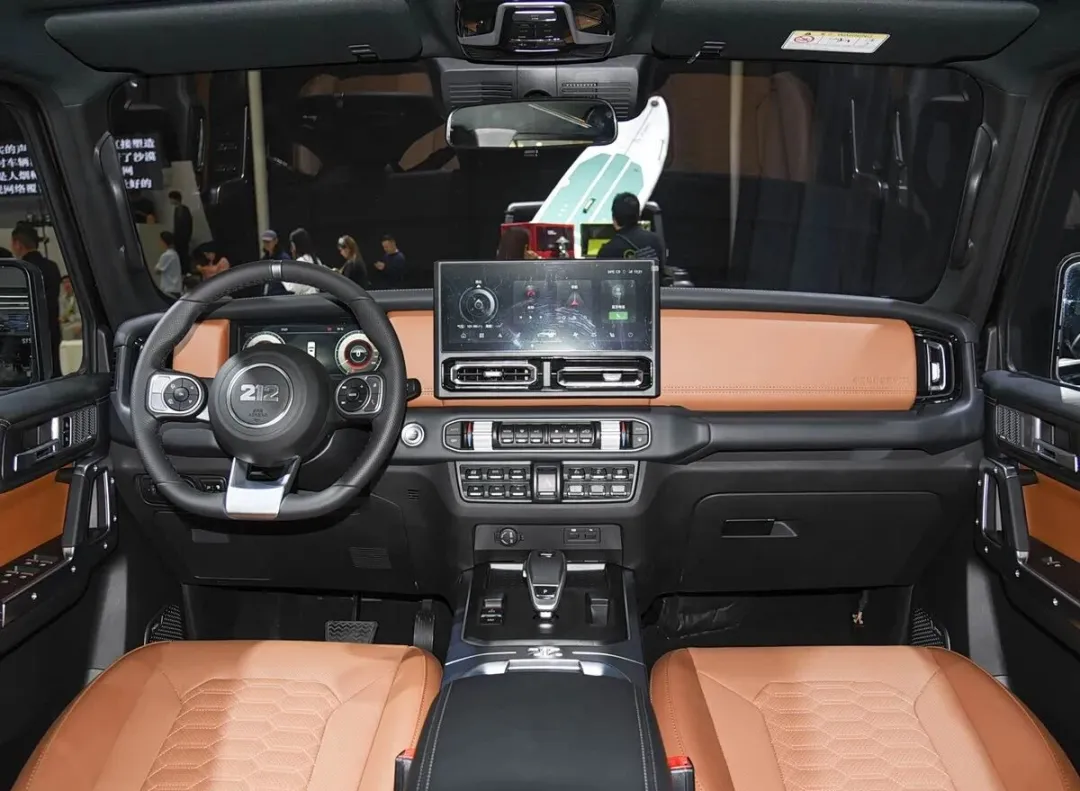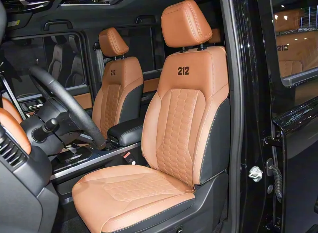 动力方面,212 T01长风柴油版搭载2.0T柴油发动机,最大功率125kW(170马力),峰值扭矩415N·m ,传动系统匹配采埃孚8AT变速箱与博格华纳分动箱。依托博世2000bar高压共轨技术,综合油耗8.5L/100km,搭配80L油箱,满油续航近1000公里。同时,车辆采用非承载式车身+前后五连杆整体桥式悬架,配合智能分时四驱(支持 2H/4H/4L,4L扭矩放大2.5倍)。