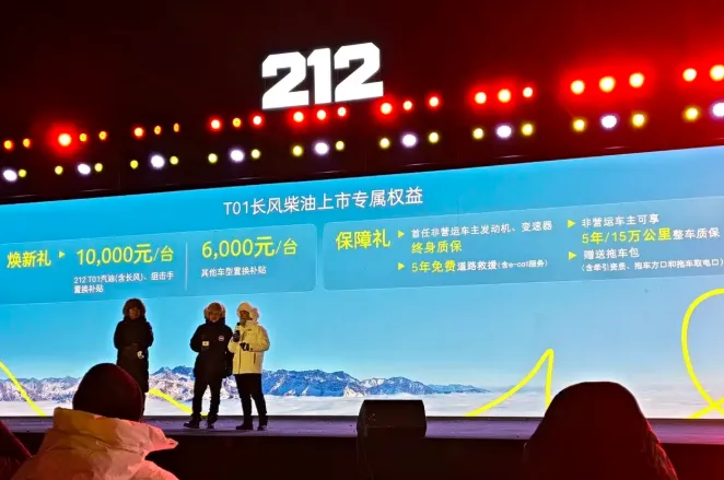 12月12日,212 T01长风柴油版正式上市,官方指导价19.88万元。本品车型置换补贴1万元,其他车型置换补贴6000元。该车采用2.0T柴油发动机与8速手自一体变速箱的动力组合,提供越野轮胎、绞盘等装备,定价相比212 T01长风汽油版(官方指导价:18.88万元)高了1万元。新车在此前的广州车展首发亮相,采用更加硬派的外观,搭载2.0T柴油发动机,峰值扭矩415N·m,满油续航近 1000km。