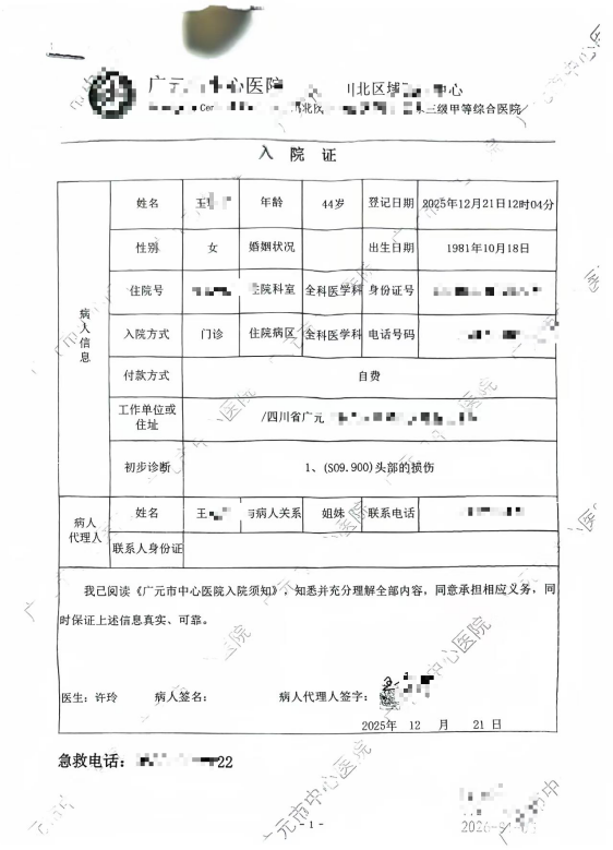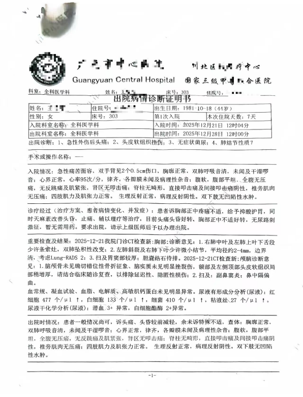 事发当日,身体多处不适的王女士前往广元市中心医院就诊并入院治疗,住院费用均由其自费承担,经诊断确诊为急性外伤后头痛、头皮软组织挫伤等病症,入院时呈急性痛苦面容,手部有伤口,头部软组织存在异常,尿液多项指标超标,经7天针对性治疗后于12月28日出院,虽症状有所缓解,但仍需后续复查,此次遭遇也给其留下了心理阴影。