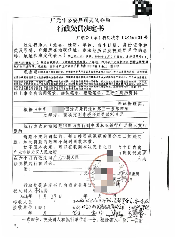 2026年1月30日,广元市公安局朝天区分局羊木派出所对该起事件作出正式处置,出具两份行政处罚决定书,认定李某香、李某环在无任何事实依据的情况下故意滋扰王女士并致其抓伤,二人行为已构成寻衅滋事违法行为。然而,执法部门工作人员结合二人主动到案的情节,仅对二人各处以900元罚款,要求15日内自行到银行缴纳,逾期将按规定加处罚款。这份处罚不仅与王女士所受的身体伤害、精神损害形成明显不对等,更存在突出的行政处罚适用法律错误问题;且事发后王女士家属前往派出所沟通时,执法部门工作人员曾口头告知涉事二人将被处以拘留处罚,最终的罚款结果与此前口头告知内容严重相悖,让执法的公正性备受质疑。