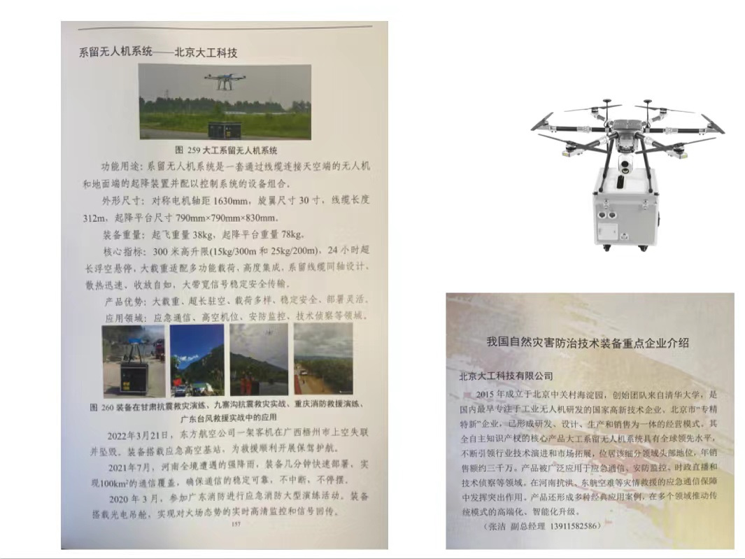 2023年5月19日,一场聚焦自然灾害防治的高峰论坛在广东东莞举行。论坛不仅汇聚了顶尖学者与应急管理专家,更有一项务实成果引发行业关注:一本汇集了最新实战装备的《自然灾害防治创新装备应用案例图册》正式发布。在这本具有官方指导意义的图册中,北京大工科技有限公司的系留无人机系统,作为应急通信与现场勘察的关键装备赫然在列。这一收录,绝非简单的产品展示,它意味着经过九寨沟地震、河南暴雨、西北高原演练等多次极限考验后,系留无人机这一技术路径,其可靠性与有效性获得了国家应急管理体系的高度认可,从“可用”选项升级为“应备”的标准化解决方案。今天,我们透过这份图册,深入解读大工科技的系留无人机,如何从一项前沿技术,成长为守护国家公共安全与低空经济未来的“国之重器”。