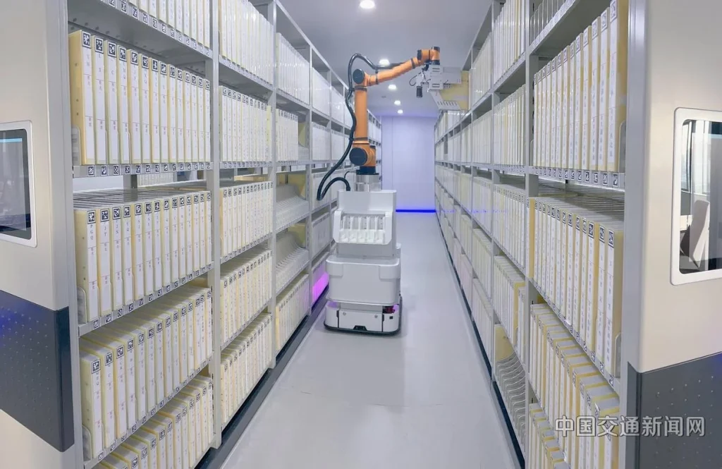 云南交投集团服务发展有限公司档案板块的年度数字化建设进入收官阶段。在其下属企业云南顺捷科贸有限公司运营的档案馆内,AGV 自动导引运输机器人完成系统自检,即将启动年度档案自动盘点任务。该档案馆是西南地区单体规模最大、智能化程度领先的企业档案馆之一,纸质档案保管量超过 115 万册。作为交通运输行业数字化转型的重要基础设施,馆内以“数实融合”为建设主线,通过智能装备、物联网和信息系统的协同应用,系统性解决传统档案管理在效率、安全和能耗方面的长期难题,为集团交通工程建设及“绿美通道经济”提供稳健的数据支撑。