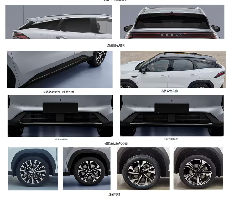 从申报图来看,银河M7在外观上延续了银河系列的设计语言,整体风格和银河M9颇为相似。车头那一道贯穿式前大灯,加上前包围处保留的格栅和两侧镀铬饰条点缀的导流槽,看起来既简洁又有层次感。车身侧面线条流畅,车顶略带溜背造型,配上传统门把手,整体感觉稳重又不失动感。车尾同样是贯穿式尾灯设计,中间镶嵌着吉利的英文标识,两侧灯组棱角分明,显得挺有精神。