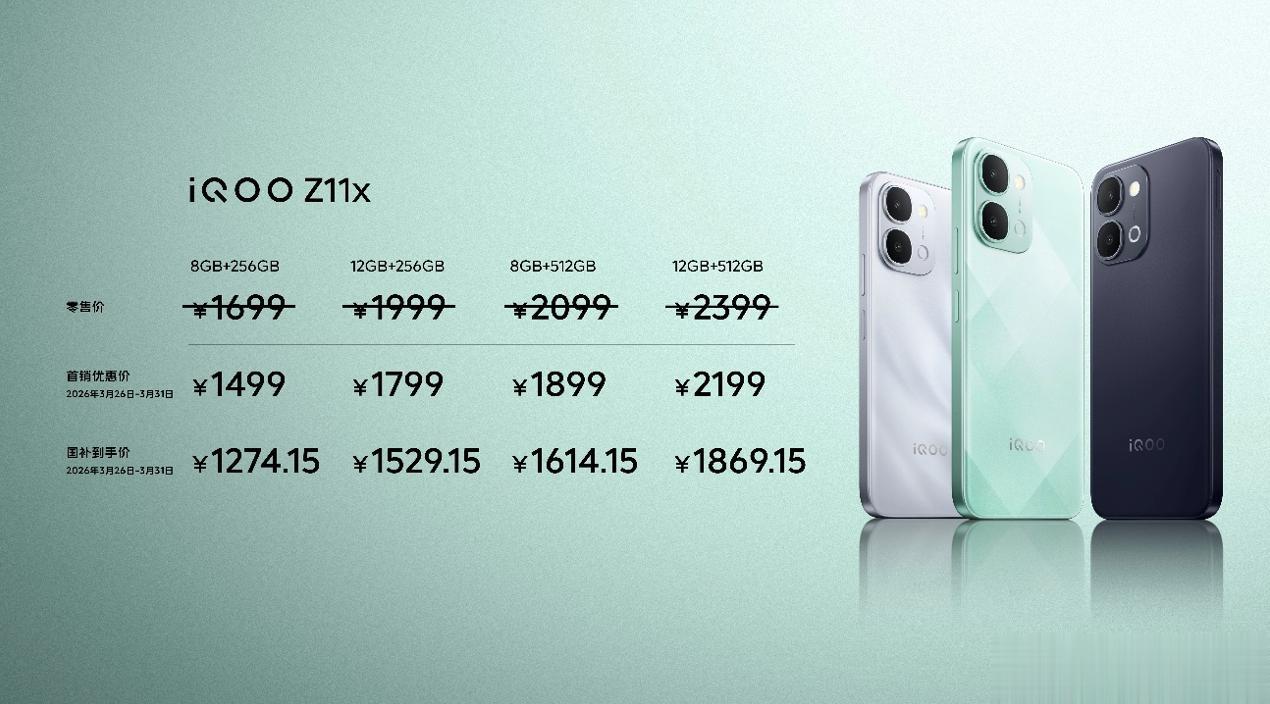 iQOO Z11x 共有 4 个版本可供选择,,8GB+256GB 版本首销优惠价 1499 元(零售价 1699 元,国补到手价 1274.15 元)、12GB+256GB 版本首销优惠价 1799 元(零售价 1999 元,国补到手价 1529.15 元)、8GB+512GB 版本首销优惠价 1899 元(零售价 2099 元,国补到手价 1614.15 元)、12GB+512GB 版本首销优惠价 2199 元(零售价 2399 元,国补到手价 1869.15 元)。