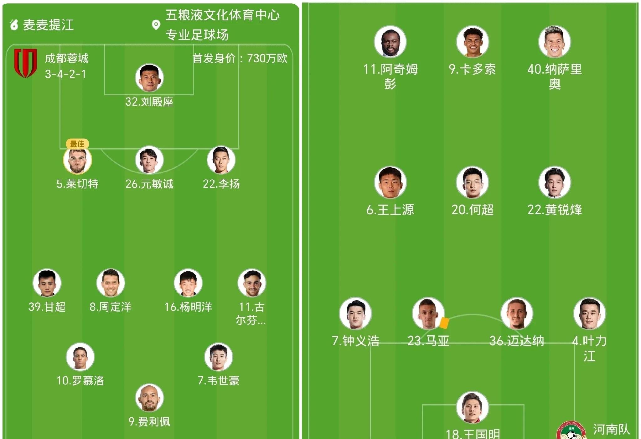 本赛季至今,蓉城三线作战表现不俗,联赛处于争冠行列、足协杯也连战连捷,还有亚冠要打,非常考验阵容深度;而河南压力不小,虽然在足协杯赛场上表现不俗,但联赛距离降级区仅有5分,保级任务艰巨;近期,双方都在上一轮联赛轮休了主力,旨在全力冲击足协杯。此役雨中作战,胡荷韬伤愈复出坐镇替补,双方均派出5外援的首发阵容对拼!