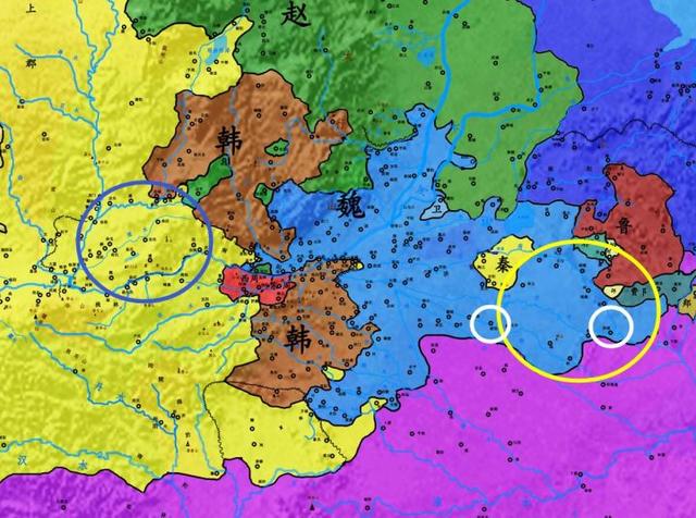 蓝圈为河东郡,当时该地仍处于秦魏的纠缠当中。