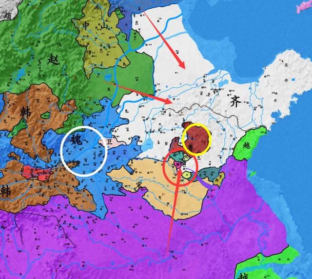 白圈为齐国名义上的盟国魏国,在这一战中并未对齐国进行军事协助,不过也未参与对齐人的后续围攻。