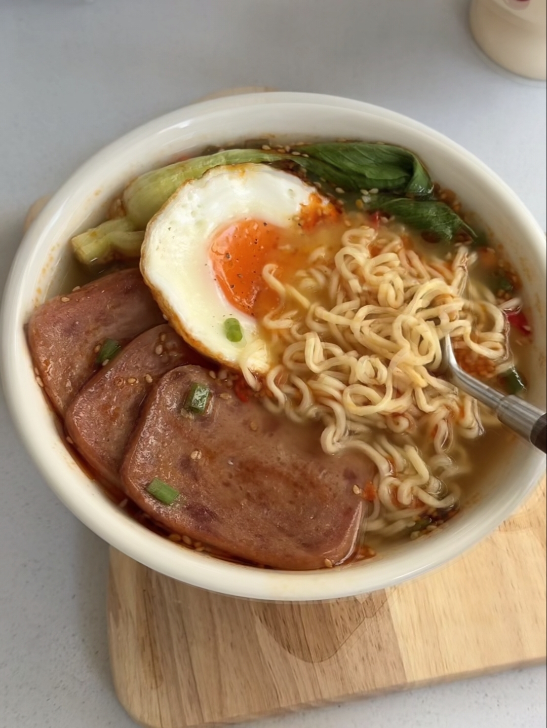 端上桌的时候,酸香混着辣香飘满整个厨房,面条吸饱了汤汁,筋道又入味,午餐肉焦香四溢,流心荷包蛋咬开的瞬间,蛋黄裹着汤汁流进嘴里,小青菜的清爽又解腻。我家娃每次都先把煎蛋吃了,再呼噜呼噜吃面,最后端起碗把汤喝光,还不忘跟我说:“妈妈,这面比外面卖的还好吃!”