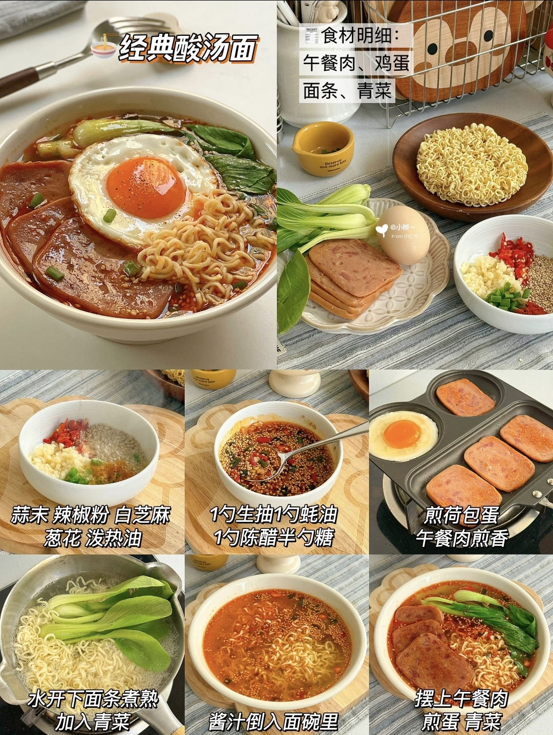 其实这碗酸汤面是我跟外婆学的,小时候放学回家,外婆总能端出一碗冒着热气的酸汤面,酸溜溜辣乎乎的汤头,配上煎得焦香的午餐肉和流心荷包蛋,瞬间扫光一天的疲惫。后来自己当了妈,就把这道面改良成了快手版,保留了外婆做的灵魂味道,又适配了现在快节奏的生活,成了我家餐桌的“常驻嘉宾”。