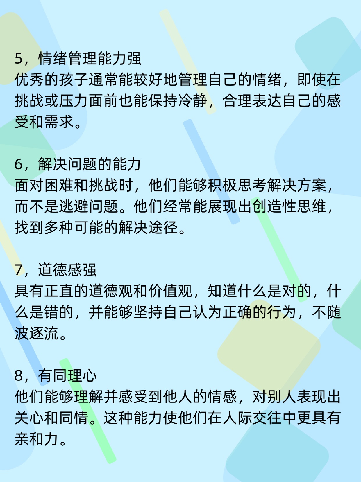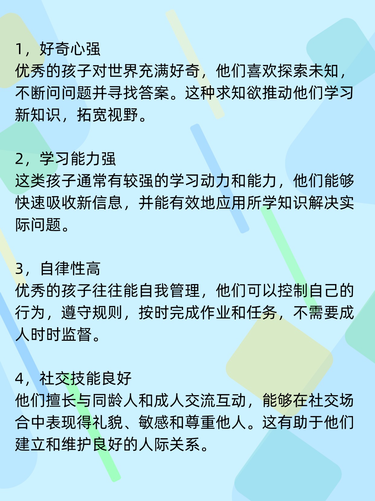 优秀的孩子通常具备以下几种特质,这些特质帮助他们在生活和学习中表现出色。