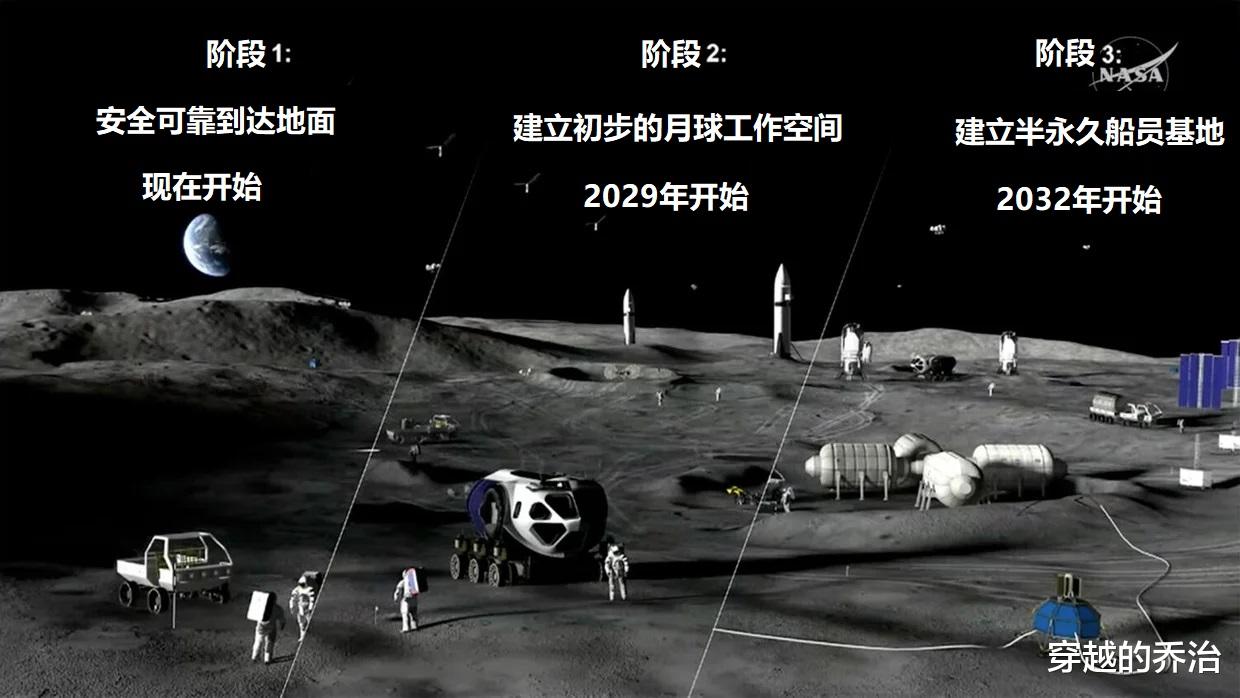 NASA分三个阶段建造月球基地。第一阶段是每年一次的月球登陆实验任务中得到成熟经验和途径,随后大幅增加月球着陆次数,以运送探测车、仪器和技术载荷。第二阶段是建立宇航员在月球表面活动的工作空间和基础设施。第三阶段是建立维持人类存在所需的永久性基础设施。整个基地具有新的核能和太阳能系统、载人和无人探测车,用于基建的工程机械、月面类手机通信网络、月球GPS系统,月球观测和通信卫星中继网。月球表面基地建设是NASA的优先任务,也是未来火星计划的试验场。预计到2026年,NASA用于重返月球计划的支出达1070亿美元。