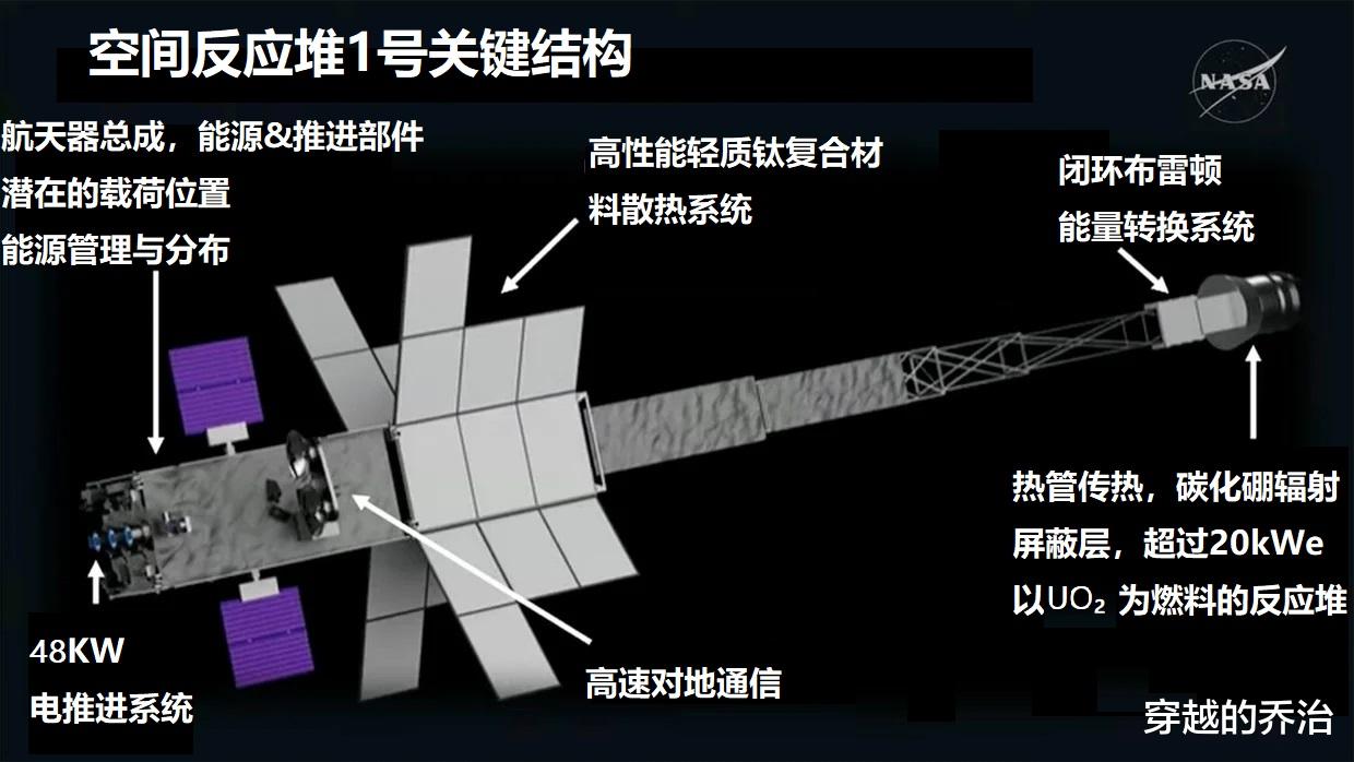 为了得到更强大空间飞行动力,首先在2028年实施空间反应堆1号(Space Reactor 1,简称SR-1)任务。使用一台裂变反应堆来驱动核电推进系统。SR-1将是NASA未来几年在月球上部署的一系列新型核能技术中的第一项。