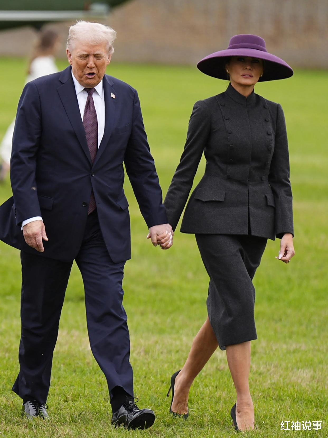 她搭配了一双同色系的深色高跟鞋,以及一顶迪奥的深淡色帽子,整体造型和谐统一。值得一提的是,梅拉尼娅的帽子还与她丈夫的领带巧妙呼应,相得益彰。