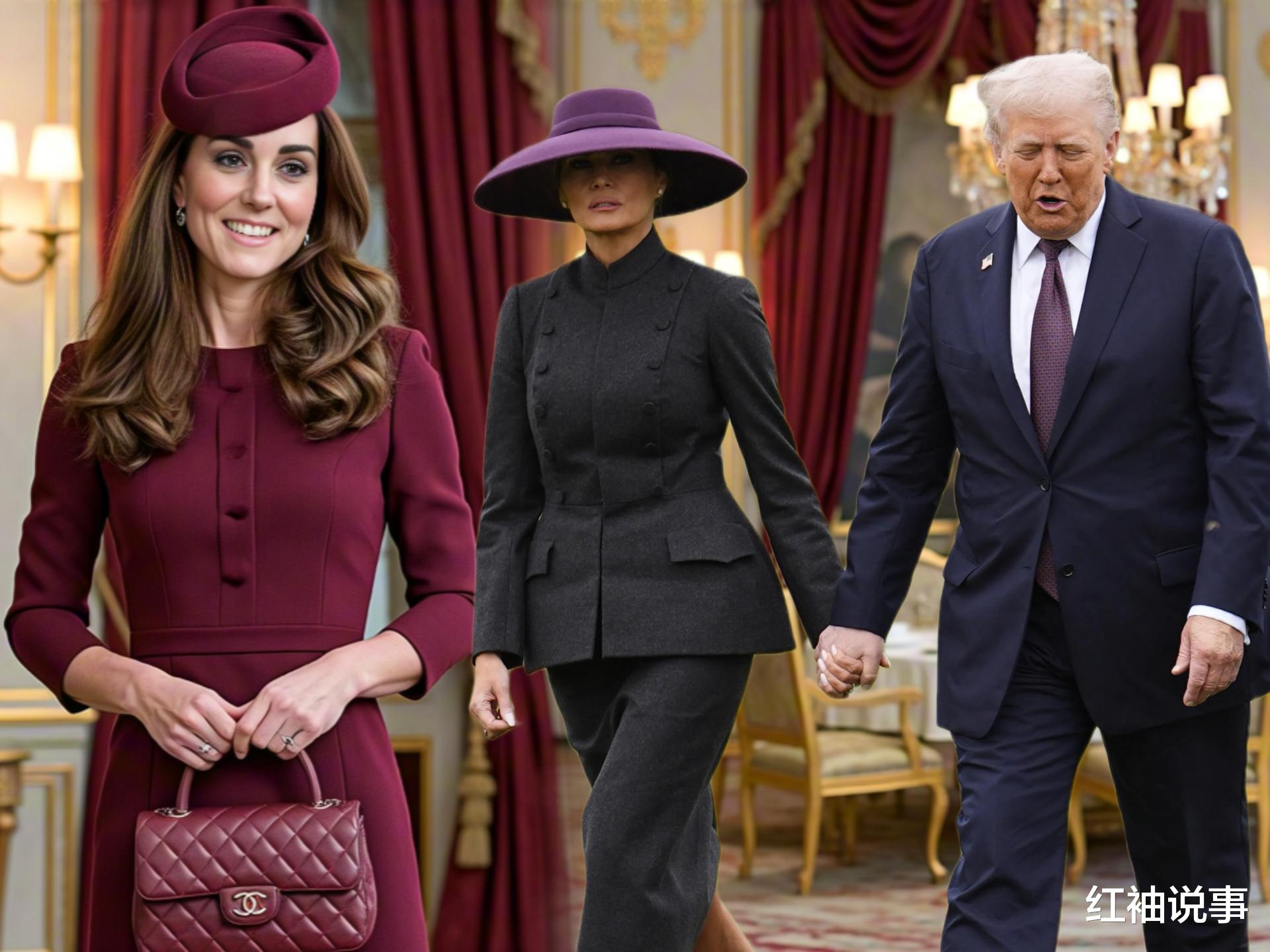 9月17日,在温莎城堡,威尔士王妃凯特·米德尔顿,与威廉王子热情接待了特朗普夫妇。这一天,梅拉尼娅和凯特皆身着酒红色与茄子色交织的秋季色调服饰,并佩戴了吸睛的声明头饰,成为众人瞩目的焦点。