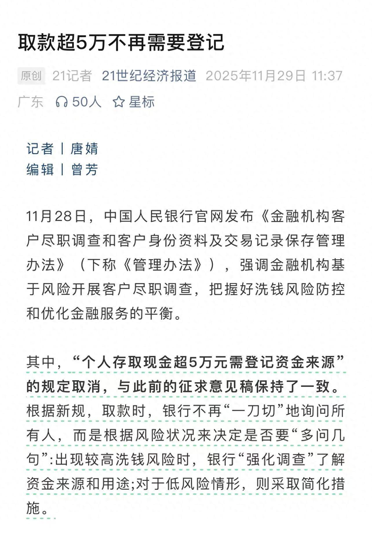 其中,该新规最重要的条款,和普通老百姓、银行柜员息息相关的就是,取消了“个人存取现金超5万元需登记资金来源或用途”的规定!即存取款超5万元,不再需要登记!