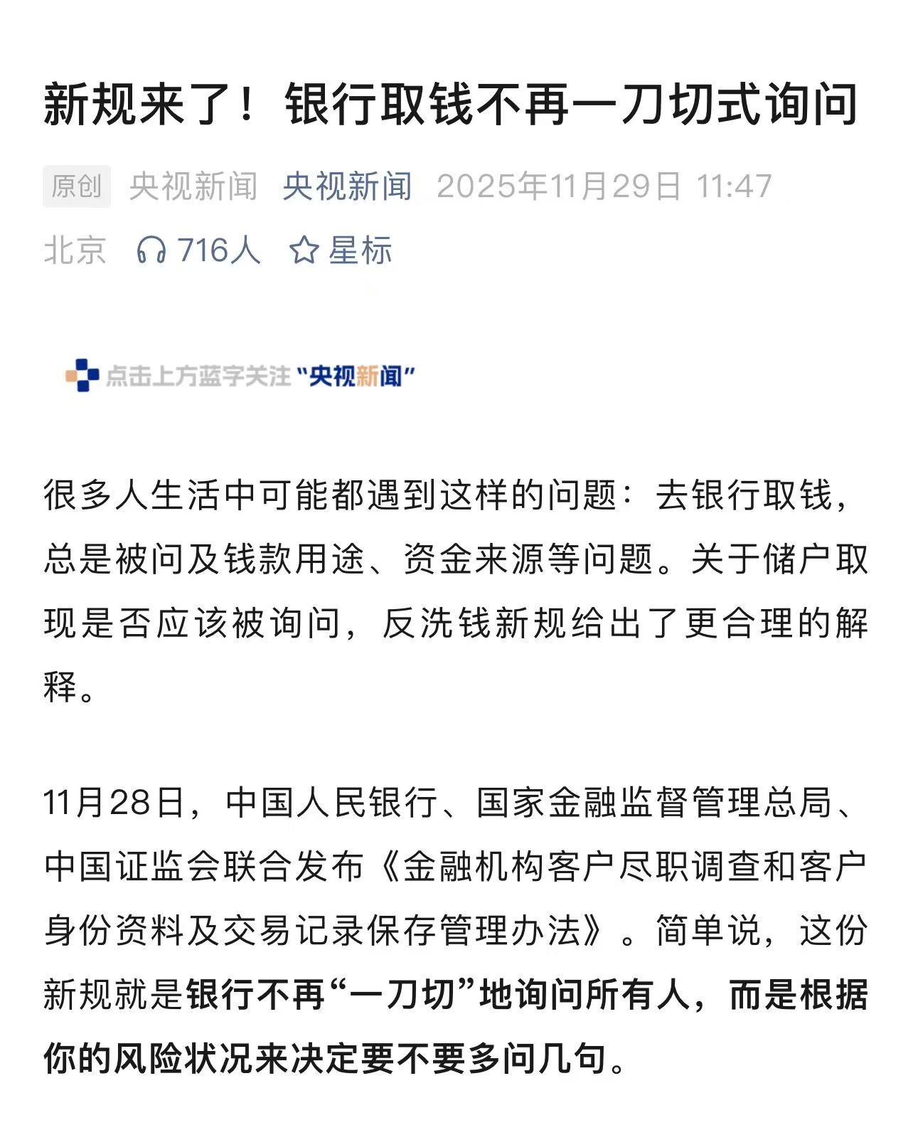 昨天(2025年11月28日)傍晚17时,中国人民银行在其官网,发布了三部委(中国人民银行、国家金融监督管理总局、中国证监会)新版的《金融机构客户尽职调查和客户身份资料及交易记录保存管理办法》(以下简称“该新规”),从2026年1月1日起施行。