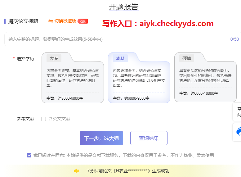AI大师写作开题报告版本分为极速版和专业版,建议选择专业版(可根据自身要求选择大纲内容,生成定制化的开题报告)。