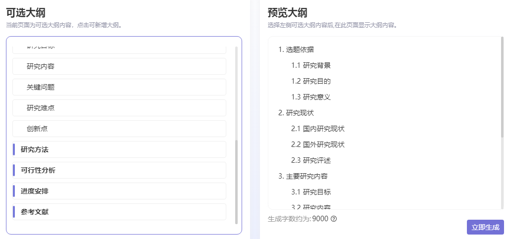 生成后的开题报告内容包含:选题依据(研究背景、研究目的、研究意义)、研究现状(国内研究现状、国外研究现状)、主要研究内容(研究目的、研究内容、关键问题、研究难点、创新点)、研究方法、可行性分析、完成措施及进度安排、主要参考文献等部分。
