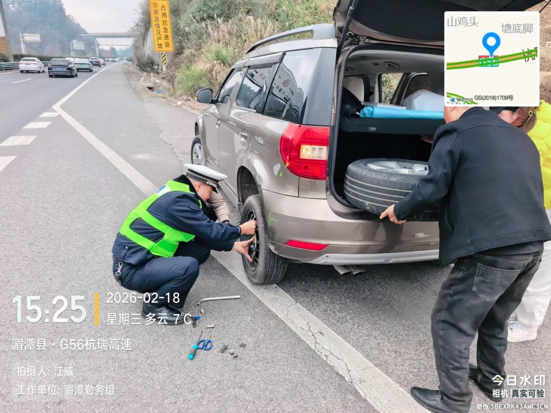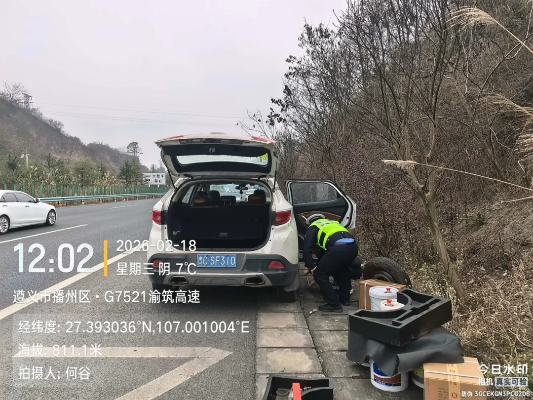 爆胎不用慌,交警来帮忙春节期间,多起车辆爆胎警情接连发生:2月18日15时许,高速二大队民警江威、罗礼伟巡逻时发现爆胎车辆,仅用十余分钟完成备胎更换;2月18日中午,高速三大队联合巡逻组帮助渝A籍轿车更换轮胎;2月18日,龙坪勤务组何谷巡逻时帮助贵C籍轿车更换轮胎;2月18日,巡逻组在银百高速帮助渝A籍轿车换胎……每一次俯身,都是对平安的守护;每一滴汗水,都折射着为民的初心。