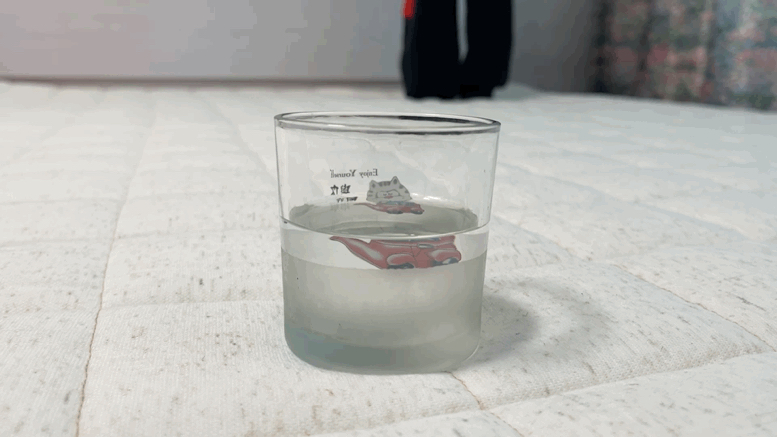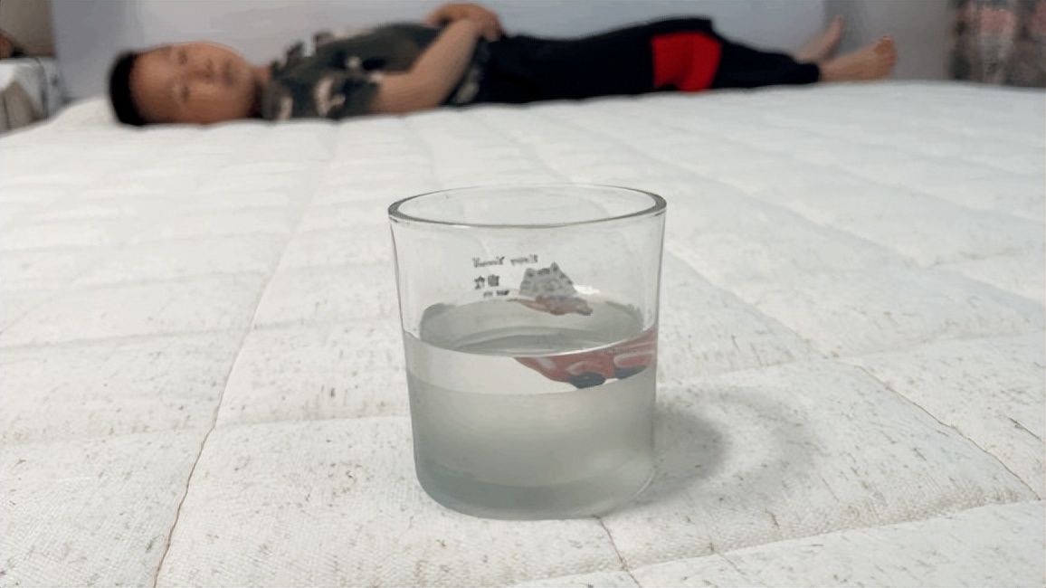 但是毕竟除了娃,家里大人很少会在床上蹦蹦跳跳。所以楼主又通过了近距离的翻身滚动进行了测试,杯子里的水面依旧没有太明显的晃动,说明在实际使用过程中,身旁有人近距离翻身的影响应该也不是很大。并且水杯稳稳的在床上,丝毫没有倾倒和洒水的迹象,足以证明独立套袋弹簧床垫在支撑方面的优势。