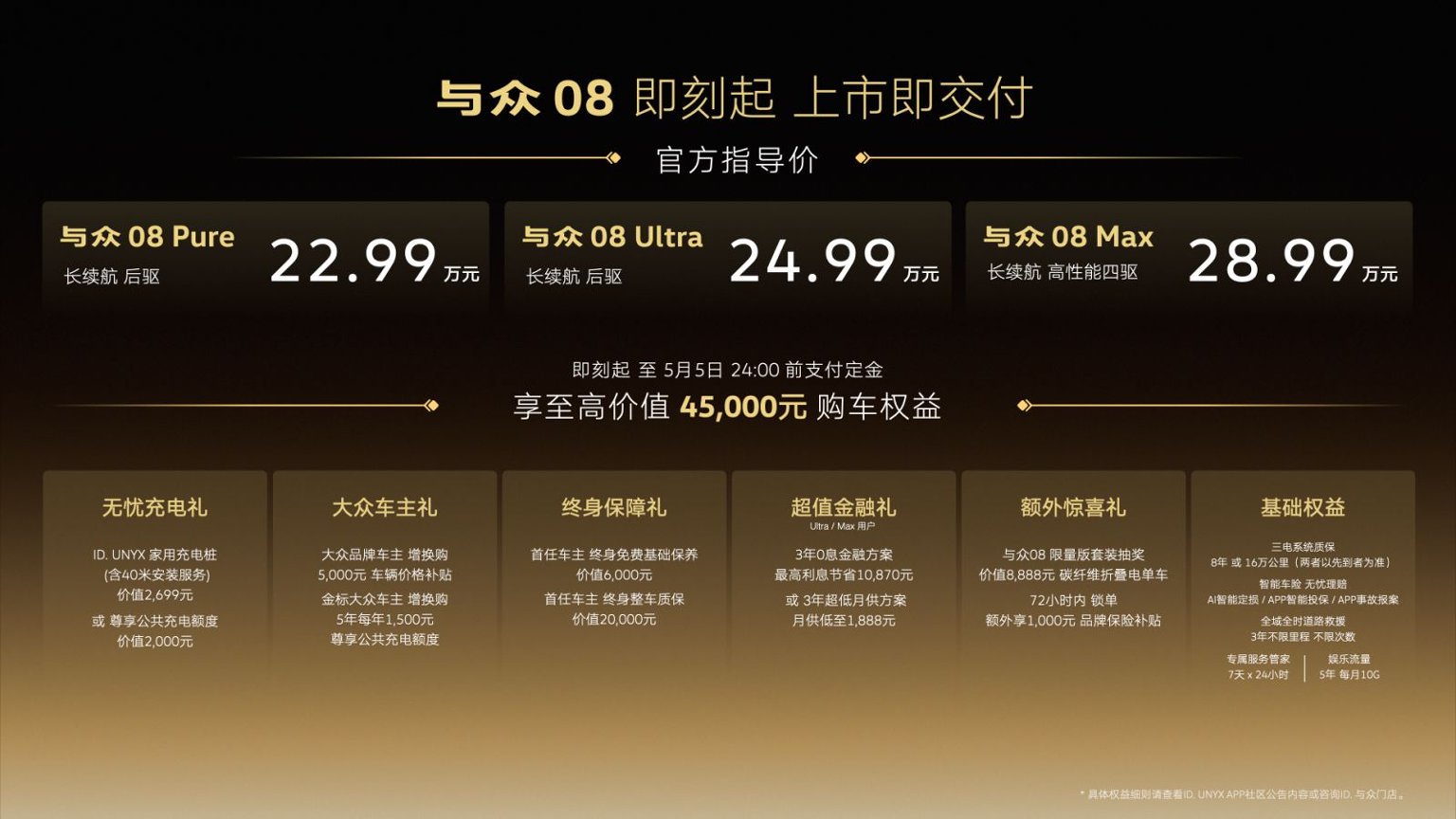 2026年4月16日,ID.与众08正式上市,推出Pure、Ultra、Max三款车型,官方指导价22.99万元至28.99万元,即刻下定并在5月5日前完成购车,可享至高4.5万元综合权益。