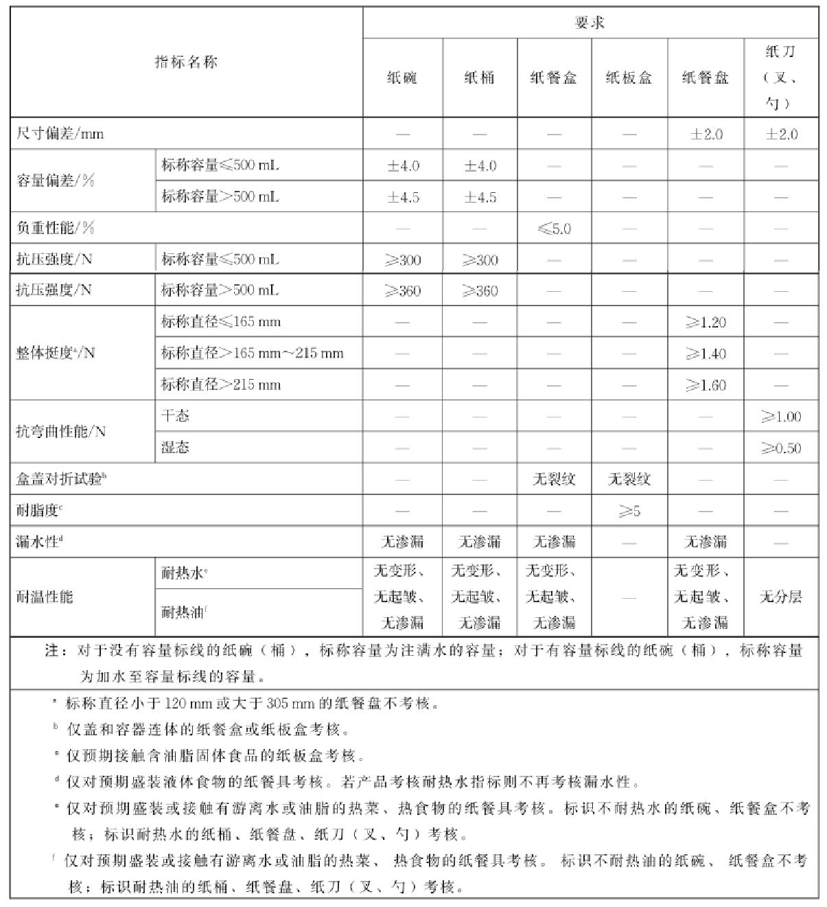 纸餐具按加工方式或用途分为纸碗、纸桶、纸餐盒、纸板盒、纸餐盘、纸刀、纸叉、纸勺等,按材质则可分为纸质餐具、淋(覆)膜纸餐具和涂层纸餐具。纸餐具得技术要求包括:内在质量、内装量短缺量、生物分解性能、可堆肥性能、外观质量、配合性等,其中内在质量、内装量短缺量、外观质量和配合性为出厂检验项目,生物分解性能和可堆肥性能属于协定检验项目。