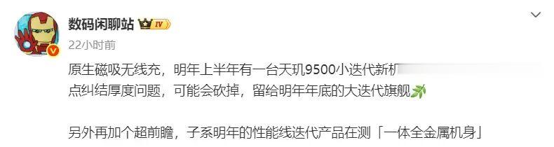 与此同时,该博主今日还爆料了vivo的另一款新机:某厂的天玑 9500 芯片小迭代新机正在测试原生磁吸无线充。