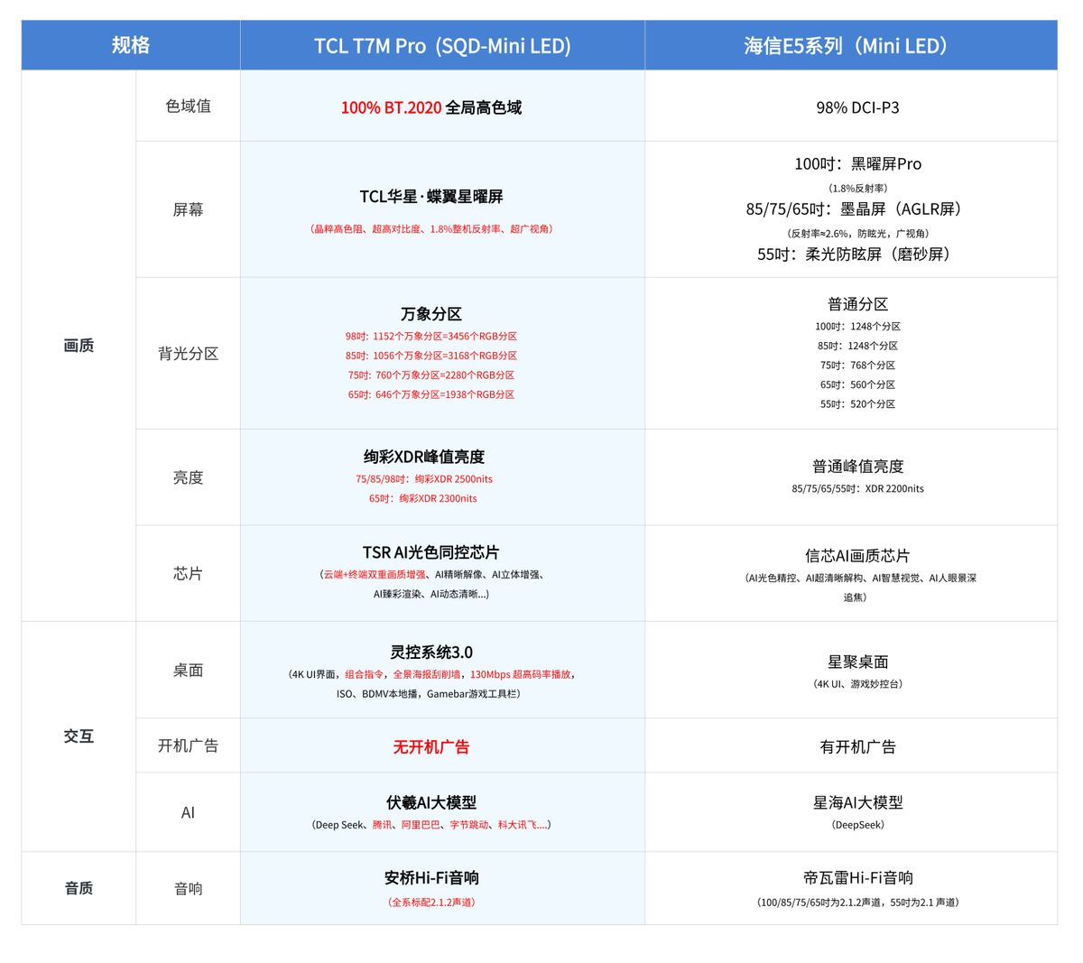 两款机型均为五千元档大品牌热门款,适配不同需求:海信E5系列基础配置可以满足日常观影,在这个价位段对比其他产品有一定优势;而TCL T7系列尤其是最新的T7M Pro凭借 SQD-Mini LED技术的舒适级护眼、满足画质铁三角的顶级画质,一步到位解决护眼和画质核心需求。看完,你们会怎么选?