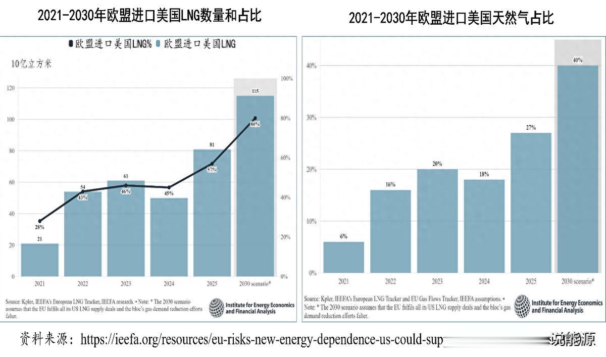 如果所有这些交易得以实现,设在美国俄亥俄州山谷城的能源经济和金融分析研究所(Institute for Energy Economics and Financial Analysis,IEEFA)预计,2030年,欧盟从美国进口的液化天然气将增加到约1150亿立方米,这意味着欧盟75%至80%的液化天然气进口将来自美国。2025年,欧盟进口的天然气和液化天然气总量中,美国占比为27%。在2030年的情景下,新的液化天然气合同预计将使这一比例在2030年升至40%。