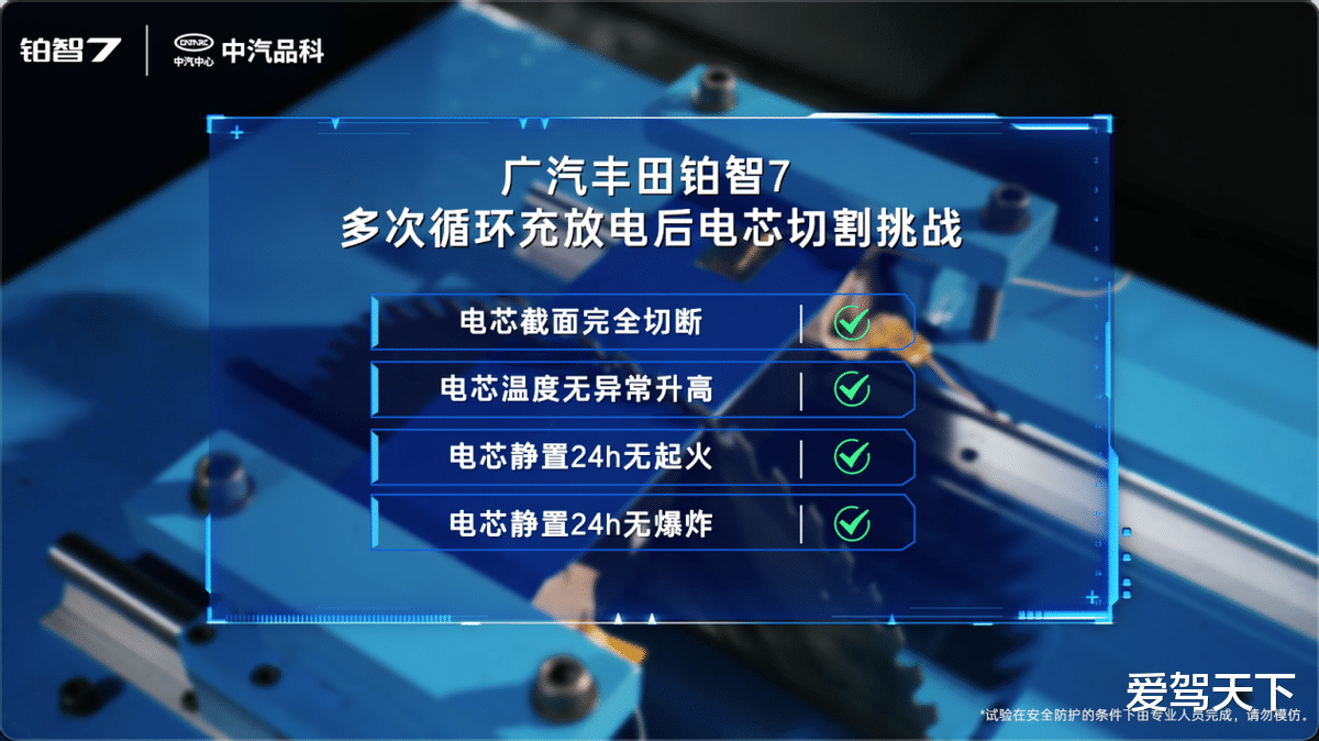 在最严重的“超高速碰撞、大卡车前后夹击追撞、翻车坠崖”等等极端事故场景,受损电芯是否能保证不起火、不爆炸,直接决定了乘员获救的可能性。“电芯切割”测试,正是面向这类场景而来。