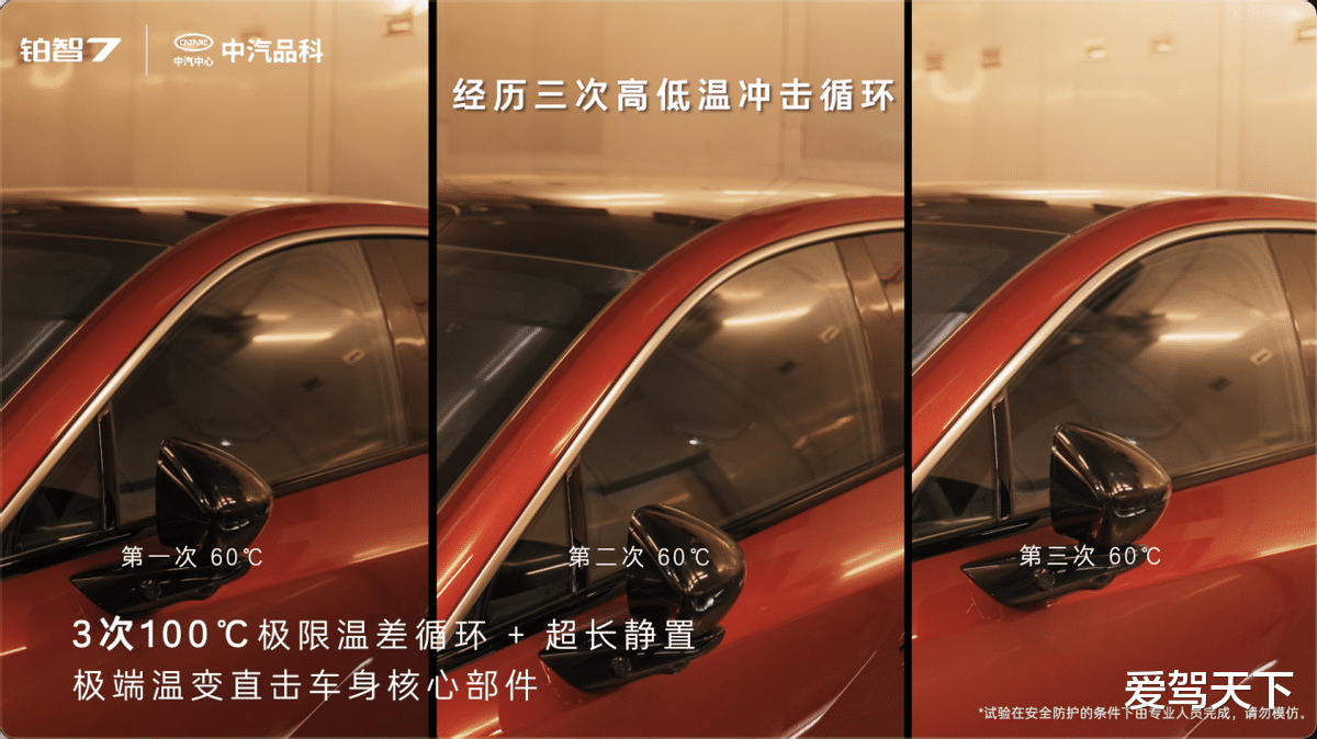 “整车极寒极热循环冲击”覆盖-40℃到60℃的极限温差,相当于从寒冬腊月的内蒙古牙克石,到七八月份的新疆吐鲁番。3轮急剧、宽幅的温度变化对车辆的电子电气系统、密封件、内饰材料等都构成严峻考验。测试后,车辆外观无变形、车机功能操作全部正常。意味着中国境内任意气温环境变化都不会对车辆造成损坏。
