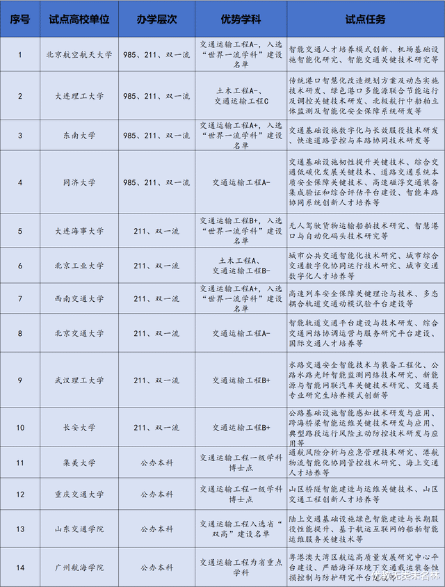 这十四所院校中,除了国家级重点学科、“双一流”等重大工程中有突出表现的院校之外,还有大连理工大学、北京工业大学、武汉理工大学这样的强校,也有集美大学、重庆交通大学、山东交通学院、广州航海学院这样的行业特色院校。