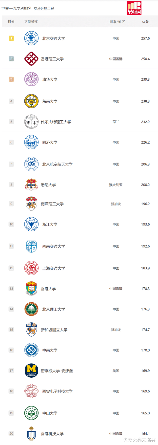 在软科世界一流学科评估中,北京交大更是高居全球榜首,清华、东南、同济、北航、浙大等院校也悉数上榜并进入前十强。当然,这种商业排名仅供参考,不作为全面衡量学科建设水平的标准。