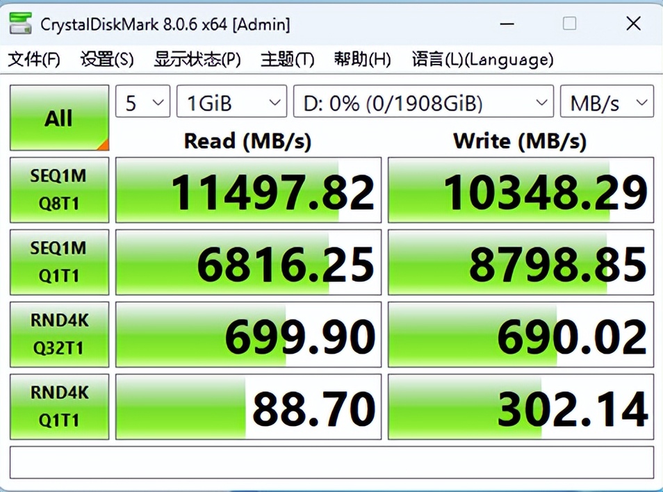 然后跑 CrystalDiskMark 测试,顺序读取直接干到 11497MB/s,顺序写入 10348MB/s,双双破万。对比Gen4 SSD,读取直接翻倍,Gen5的带宽在高速、高负载读写场景中优势太明显了。
