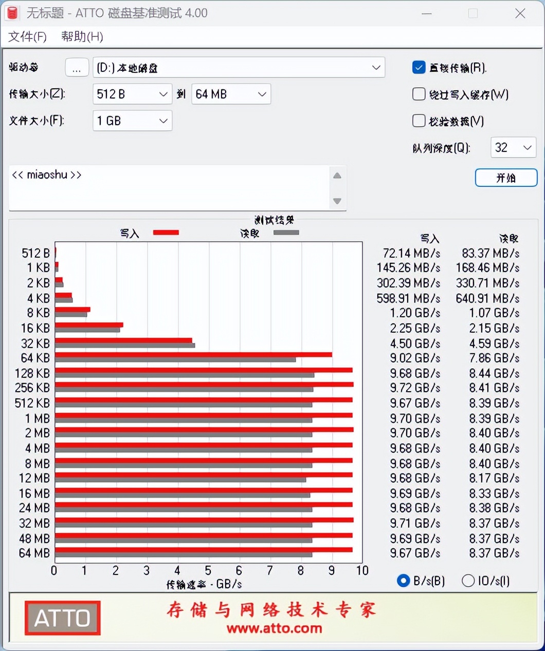 ATTO 测试中,文件大小超过 64KB 后,硬盘速度和稳定性表现良好,最高读取速度可达 9.71GB/s,写入速度为 8.44GB/s,在上面三款软件的测试结果基本一致。