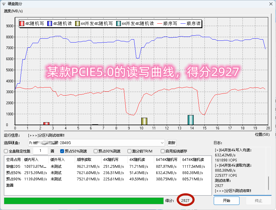 这对于需要存大量游戏、视频素材的用户来说太重要了,很多Gen5 SSD满盘后会大幅掉速,而N8000的表现也受到一定的影响,但是速度曲线比较平缓,稳定性和耐用性也更有保障。