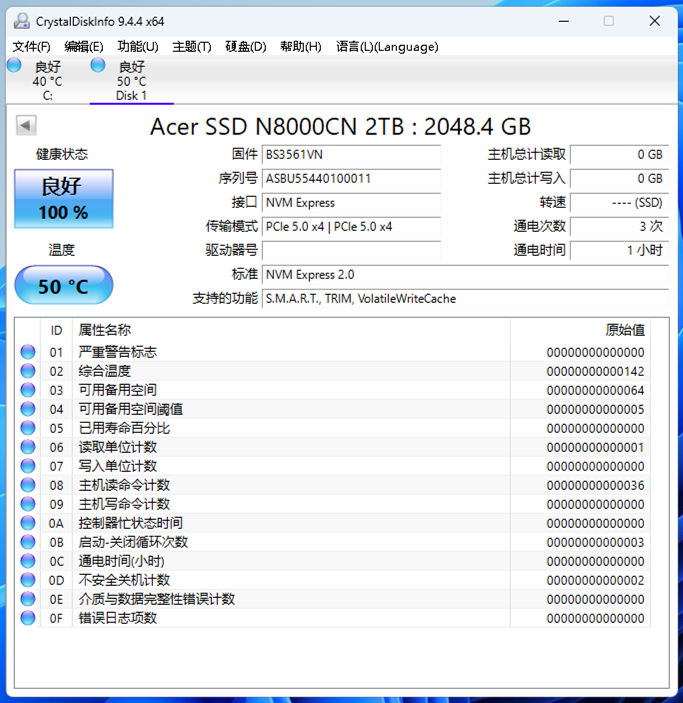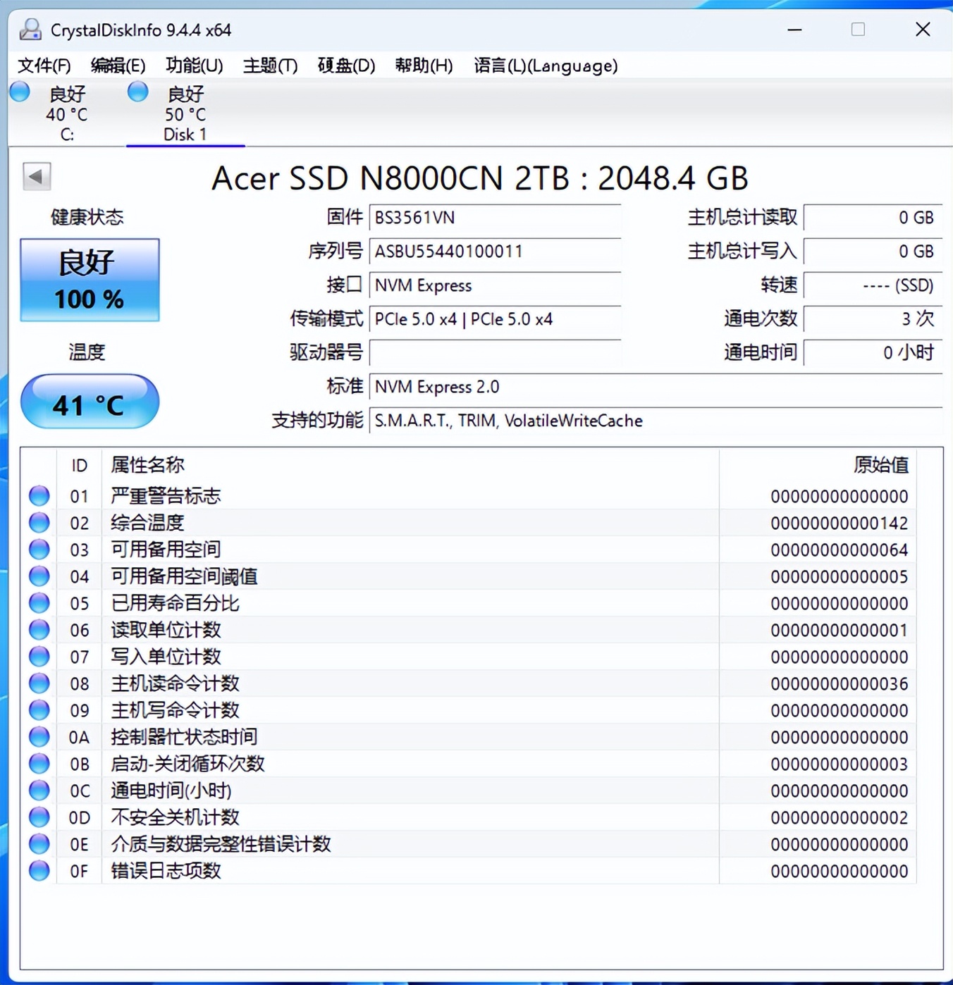首先用 CrystalDiskInfo 看硬盘信息:支持 PCIe5.0x4 和 NVMe2.0 协议,支持 S.M.A.R.T.、TRIM、 VolatileWriteCache这些实用功能,刚上机时温度只有 41℃,非常凉爽。