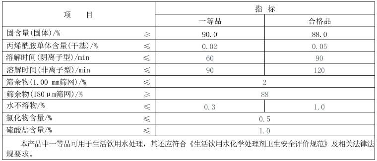 水处理剂聚丙烯酰胺的技术指标主要包括相对分子质量、阴离子度、固含量、丙烯酰胺单体含量、溶解时间、筛余物、水不溶物、氯化物含量和硫酸盐含量等。值得注意的是,由于聚丙烯酰胺的质量不仅关乎水处理效果,也和使用者的权益及水处理系统的稳定运行紧密相关,因此以上技术指标均属于出厂检验项目。